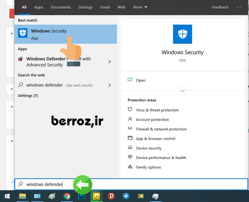 یا اگر در آنجا نیست می توانید روی منوی استارت کلیک کنید و آنجا windows defender یا windows security را تایپ کنید و روی آیکون آن کلیک نمایید »