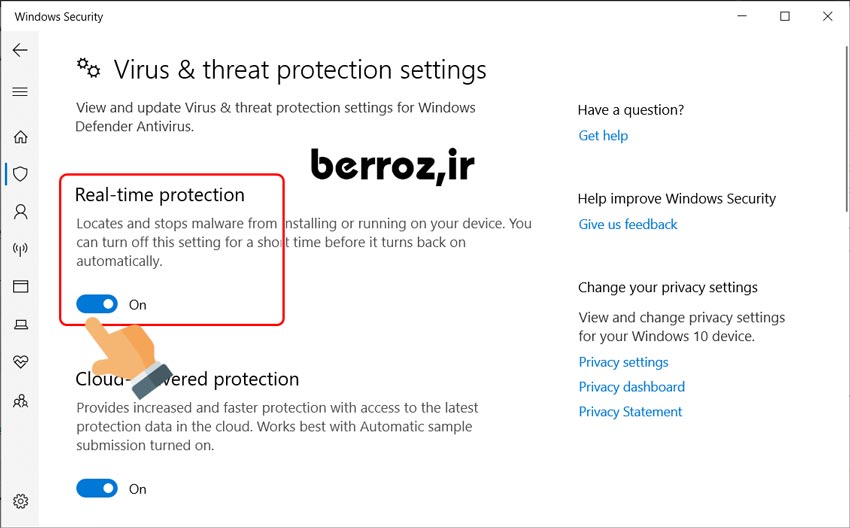 و در این قسمت وارد تنظیمات نرم افزار ویندوز دیفندر می شویم که برای غیر فعال سازی آن تیک گزینه Real-time protection زا برمیداریم و تمام.