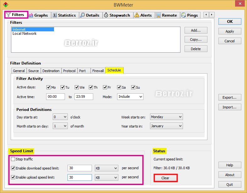 - قابلیت تنظیم فیلتر برای محدودیت در سرعت دانلود و آپلود .