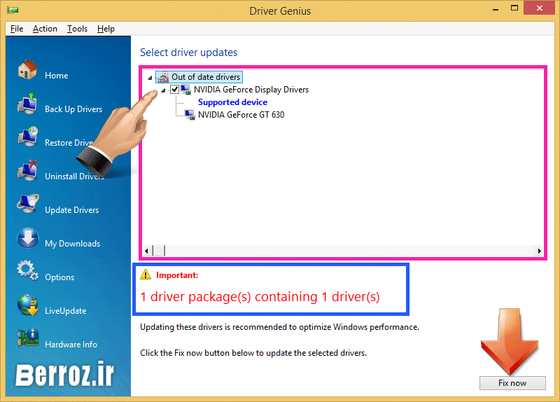 بعد از اسکن در قسمت Select driver updates و در قسمتی به نام Out of date drivers درایورهایی که نیاز به آپدیت دارن رو نشون میده ( کادر صورتی ) که می تونید با کلیک روی تیک پشت این گزینه, درایورهایی که نیاز به آپدیت دارند رو ببینید. همچنین در پایین این قسمت ( کادر آبی ) بشکل اخطار نوشته شده 1 درایور رو می تونید دانلود کنید. که در نهایت روی Fix Now کلیک می کنیم »