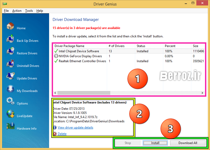 کادر 3 : که از 3 گزینه ی Stop : متوقف کردن دانلود درایورها | Install : نصب کردن درایورهای دانلود شده | Download All  : دانلود همه ی درایورها … تشکیل شده »