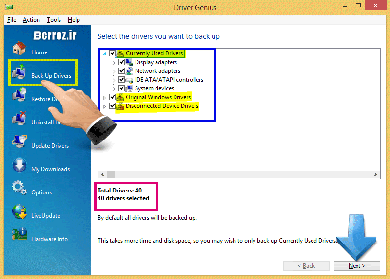 در کادر قرمز تعداد همه ی درایورها ( Total Drivers ) و تعداد درایورهایی که برای بک آپ گیری انتخاب شده (drivers selected) رو نشون میده که برای رفتن به مرحله ی بعد روی Next کلیک می کنیم »