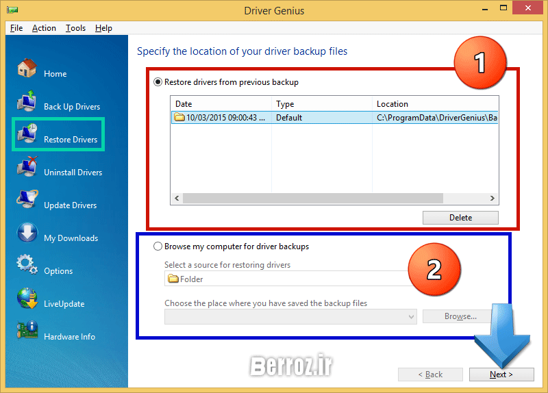 • Restore drivers from previous backup : اگر بک آپی که با نرم افزار گرفتید رو می خواهین برگردونید در این قسمت بک آپ مورد نظر رو انتخاب می کنیم …