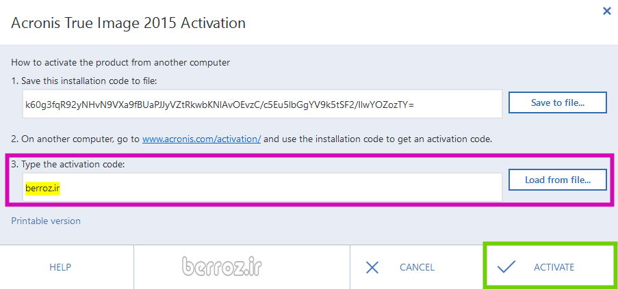 از ما کد فعال سازی یا activation code را می خواهد که می توانید berroz.com را تایپ کنید و روی Activate کلیک کنیم »