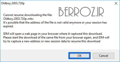 وقتی موفق به ادامه دانلود نشود، پیامی را برای رفتن به صفحهای که شما از آنجا اقدام به دانلود کردهاید را میدهد، روی Ok کلیک میکنیم »