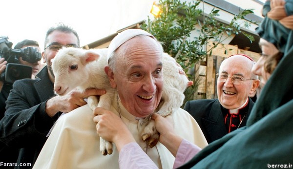 نشاندن یک بره سفید روی گردن «پاپ فرانسیس» در تعطیلات سال نو میلادی در شهر «رم» کشور ایتالیا. ۶ژانویه