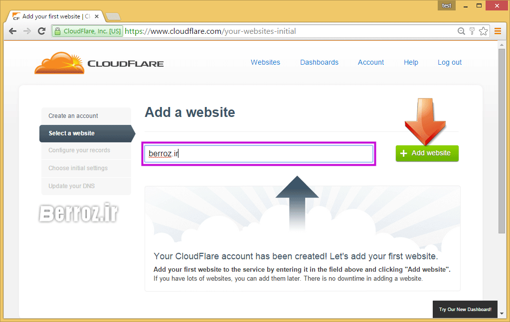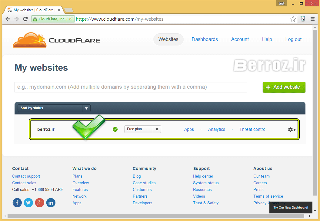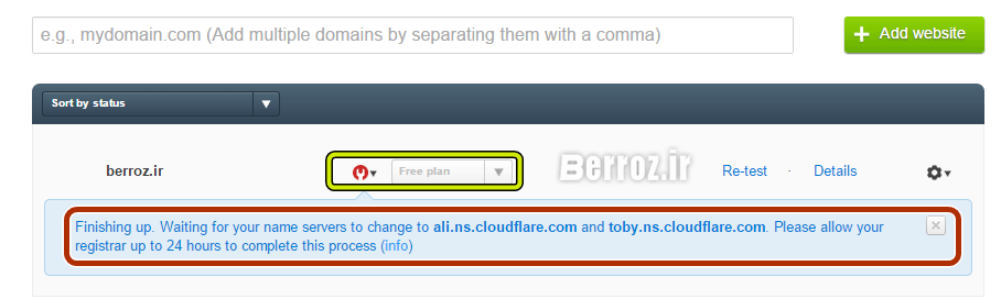 در این مرحله باید آدرس سایت رو بدون www و http وارد کنیم و روی Add website کلیک می کنیم »