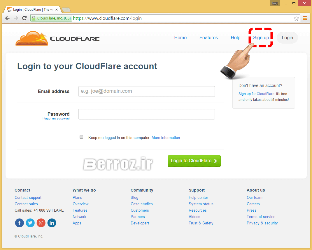 یا می توانید بعد از ورود به سایت » cloudflare.com « در گوشه ی بالا سمت راست روی Sign up کلیک کنید »