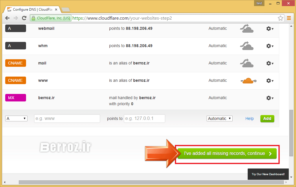 حالا بعد از اسکن dns های سایت شما … روی گزینه Continue کلیک می کنیم »