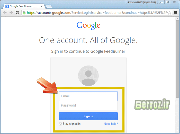 بعد از ثبت نام در جی میل روی لینک روبرو برای ثبت نام در Feedburner کلیک کنید که ابتدا باید وارد اکانت gmail خود شوید » feedburner.google.com