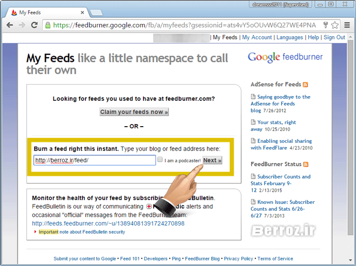 خوب در قسمت Burn a feed right this instant باید آدرس فید سایت را قرار دهید, که برای من »/https://berroz.com/feed « »