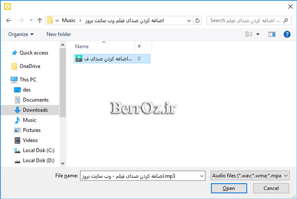 و درون پوشه مورد نظر صدای دوبله فیلم را به فیلم زبان اصلی اضافه کنیم. بعد از انتخاب فایل صوتی دوبله روی OK کلیک کنید. »