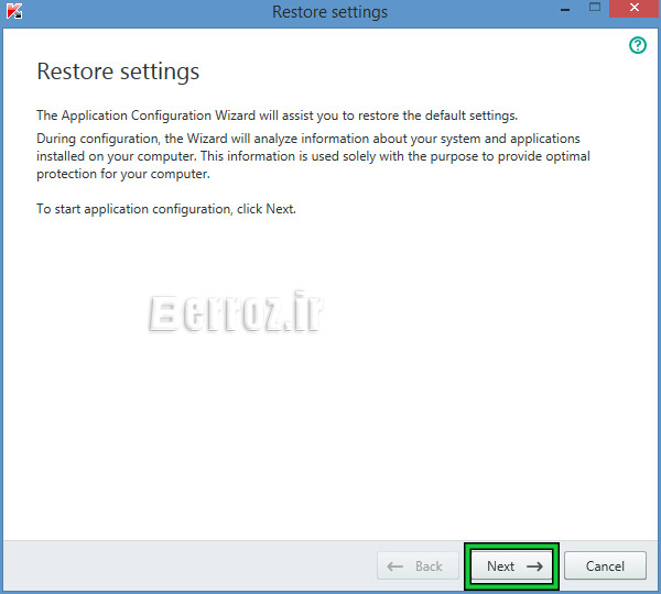 2- Restore only specified settings : بازگردانی قسمت هایی که شما انتخاب می کنید . ( که با انتخاب این گزینه می توانید فقط تنظیمات قسمت هایی که مایل هستید را بازیابی کنید. مثلا فقط قسمت آنتی ویروس , یا فقط بخش مدیریت نرم افزار و یا فقط فایروال … ) بعد از انتخاب روی Next کلیک می کنیم »