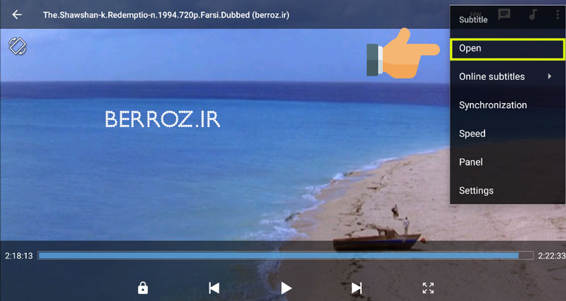 اگر فیلم شما دارای زیرنویس نیست و جداگانه برای آن دانلود کردهاید، برای چسباندن زیرنویس به فیلم در اندروید کافیست روی منو بزنیم و بعد روی Subtitle، در این قسمت روی open میزنیم »