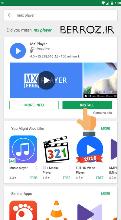 در ابتدا باید اقدام به نصب برنامه mx player کنیم که کافیست وارد برنامه گوگل پلی استور شویم و از قسمت جستجو نام آن را وارد روی نصب یا INSTALL بزنیم »