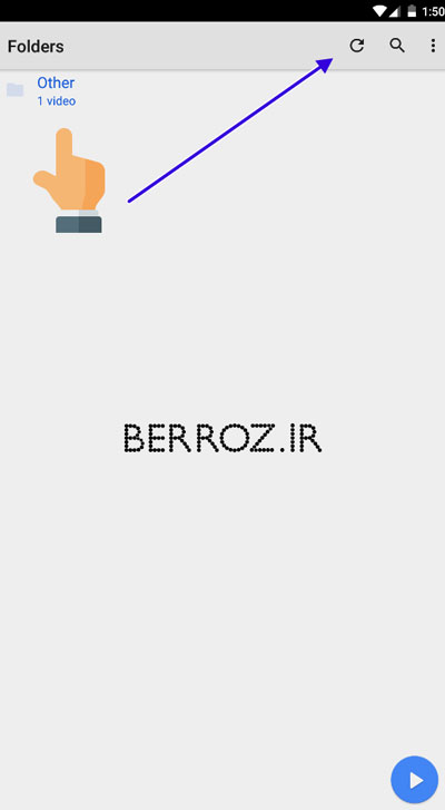 وارد برنامه پخش فیلم گوشی یعنی مکس پلیر میشویم و روی علامت تازهسازی یا همان رفرش میزنیم تا لیست ویدیوها بروزرسانی شود و اگر لیست پوشههای شما زیاد است، در صورت دانستن نام فیلم روی علامت ذرهبین بزنید و نام فیلم را وارد کنید.