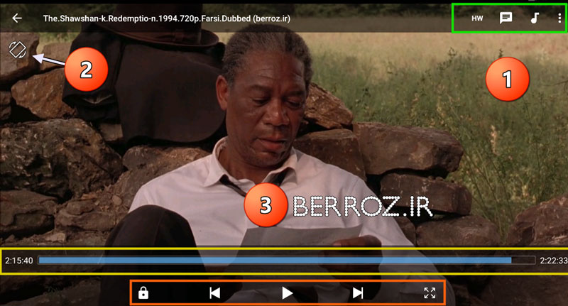 4- از راست به چپ : تمام صفحه کردن فیلم – سه فلش برای جلو، عقب، مکث و پلی کردن فیلم است – قفل کردن صفحه فیلم، که در این حالت به هیچ طریقی از محیط پخش فیلم خارج نمیشوید که این برای کسانی که بچهها به گوشی آنها دست میزنند بسیار مناسب است »