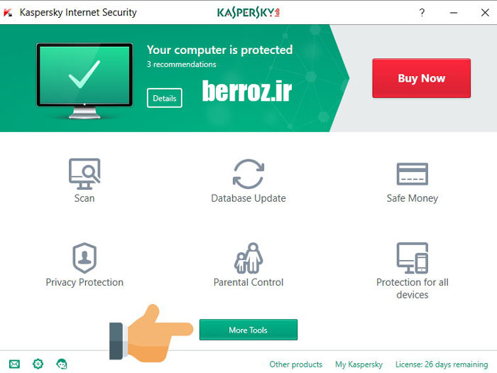 بر روی سیستم من جدیدترین ورژن اینترنت سکیورتی کسپرسکی نصب است. بعد از اجرای Kaspersky Internet Security روی گزینه More Tools کلیک میکنیم »