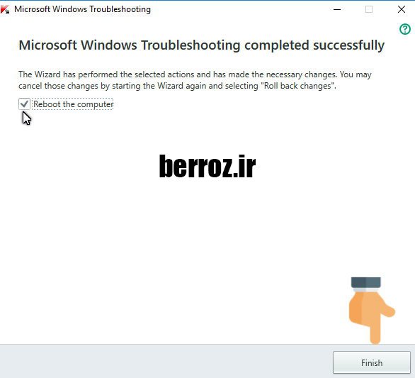 و سرآخر برای انجام تغییرات از ما میخواهد با گذاشتن تیک گزینه Reboot the computer سیستم را ریستارت کنیم. بر روی Finish کلیک میکنیم »