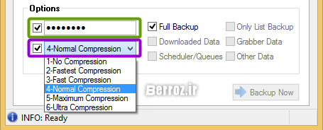 دقت کنید میتوانید روی فایل بک آپ، پسورد قرار بدهید و یا اگر حجم دانلودهای نیمه تمام شما زیاد هستند، درصد فشردهسازی را با انتخاب گزینهی Ultra Compression بیشتر کنید »