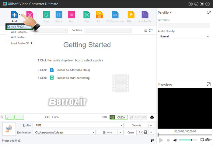 بعد از اجرای نرم افزار با محیط زیر روبرو می شوید که برای اضافه کردن فایل از منوی Add کلیک و از زیر مجموعه روی Add File کلیک می کنیم .