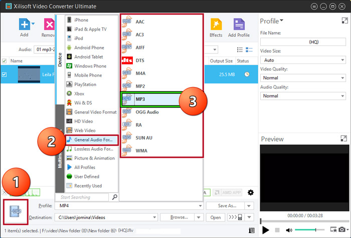 1- از Profile : نوع فرمت را انتخاب کنید یا از Destination : محل ذخیره فایل را مشخص کنید .