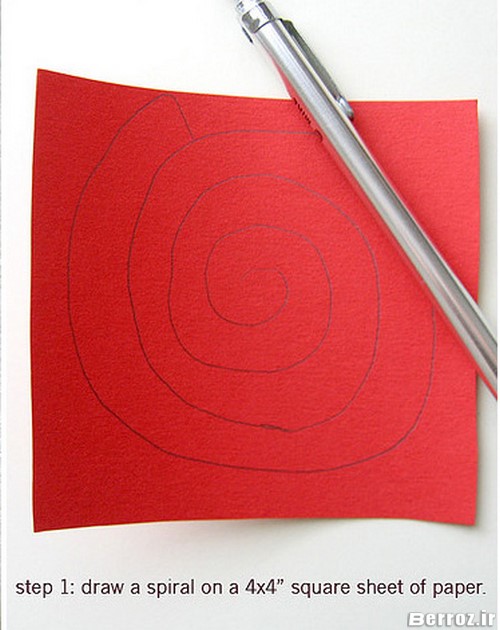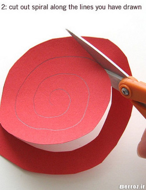 بعد از برش, از ابتدای مارپیچی که ایجاد شده شروع به پیچیدن می کنیم تا فرم گل ما شکل بگیرد و انتهای آن را با چسب بچسبانید »