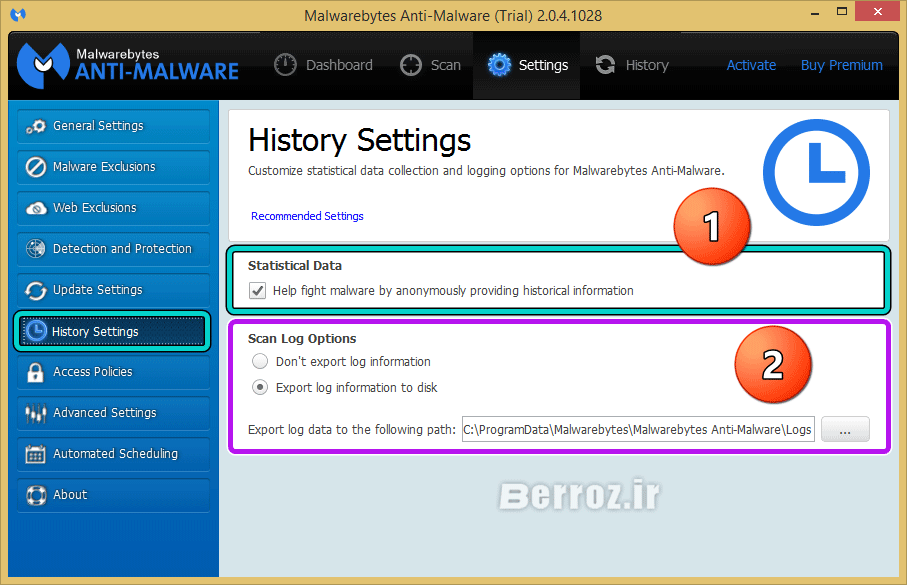 1- Statistical Date : با گذاشتن تیک این گزینه, جزئیات تاریخچه اسکن ذخیره, و به گروه آنالیزور مالواربایت برای کمک به کارایی بهتر نرم افزار ارسال می شود »