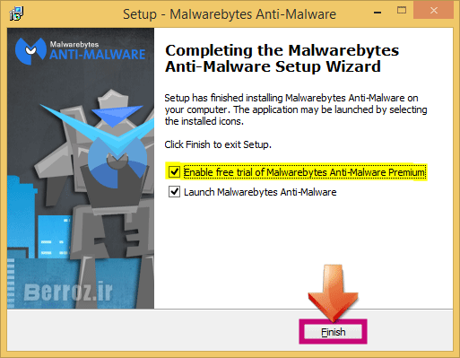 خوب بعد از نصب شما می توانید بمدت ۱۴ روز از این نرم افزار بصورت رایگان استفاده کنید. بعد از نصب, تیک گزینه ی Enable free trial of Malwarebyte Anti-Malware Permium را بگذارید و روی Finish کلیک کنید »