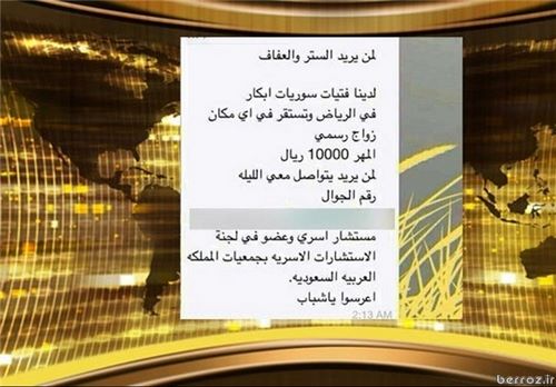 انتشار آگهی فروش دختران باکره سوری در پایتخت عربستان، با انتقادهایی در این کشور همراه شده است. در این آگهی حتی شماره تلفن فردی تحت عنوان “مشاور خانوادگی” به چشم می خورد.