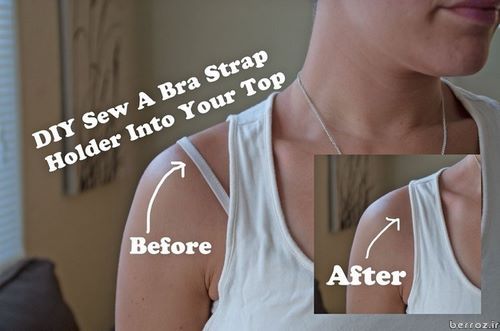 یه راه خیلی ساده … کافیه دو تا نوار کوچولو که همرنگ لباستون باشه بدوزین و به دو سر نوار ها دکمه های نر و ماده وصل کنین. سپس یک سر نوار رو به گوشه ی یقه بدوزین و سر دیگه رو آزاد بذارین. حالا کافیه بند سوتین رو لای نوار قرار داده و دکمه رو ببندید. این نوار بند سوتین رو زیر یقه پنهون میکنه.