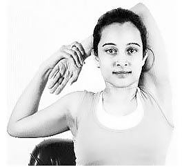 دو دست خود را بالای سر ببرید و مچ دست راست را با دست چپ بگیرید و آن را به پایین بکشید و با سر آرنج دست راستتان را به عقب فشار دهید. حال همین را با دست چپ تکرار نمایید. این حرکت را دو نوبت حداقل انجام