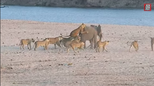دانلود کلیپ حمله ی 14 ماده شیر به یک فیل جوان !