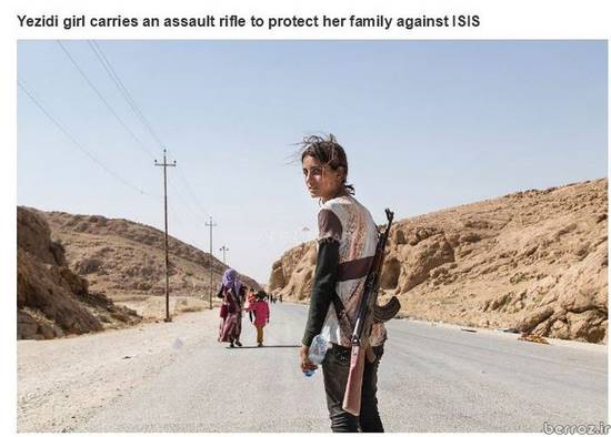 در این عکس ها حرف های زیادی برای شنیدن هست و احساساتی برای لمس کردن … که جز با حس همزاد پنداری نمی توان آنها را شنید و حس کرد. در عکس بالا دختر بچه ی ایزدی برای حفاظت از خانواده اش در مقابل داعش در گرما و با سلاح مجبور به مهاجرت می شود .