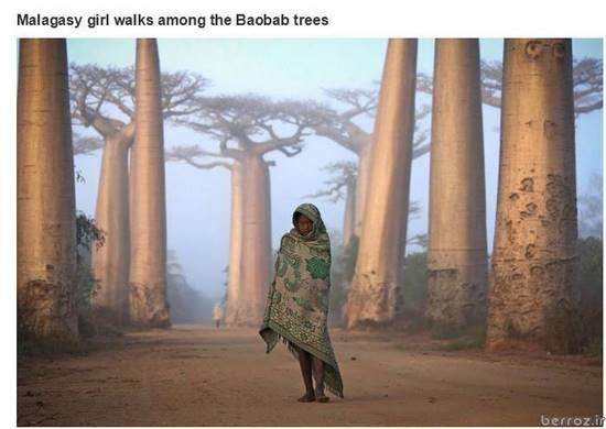 دختری مالاگایایی تنها و در فقر میان درختان آدانسونیای آفریقا “Baobab” راه می رود …