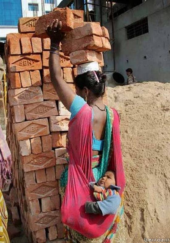 کار کردن مادر فقیر هندی با حمل کردن فرزندش …