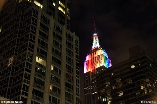 سایت دیلی میل نوشت: بعد از اینکه در هفته گذشته دادگاه عالی آمریکا محدودیت ها برای قانونی بودن ازدواج همجنس گرایان در کالیفرنیا برداشت و این ازدواج در این ایالت نیز قانونی شد، ساختمان مهم” اپایر استیت” در آخر هفته به رنگ همجنس بازان یعنی رنگین کمان در آمد و نور پردازی آن تغییر کرد.