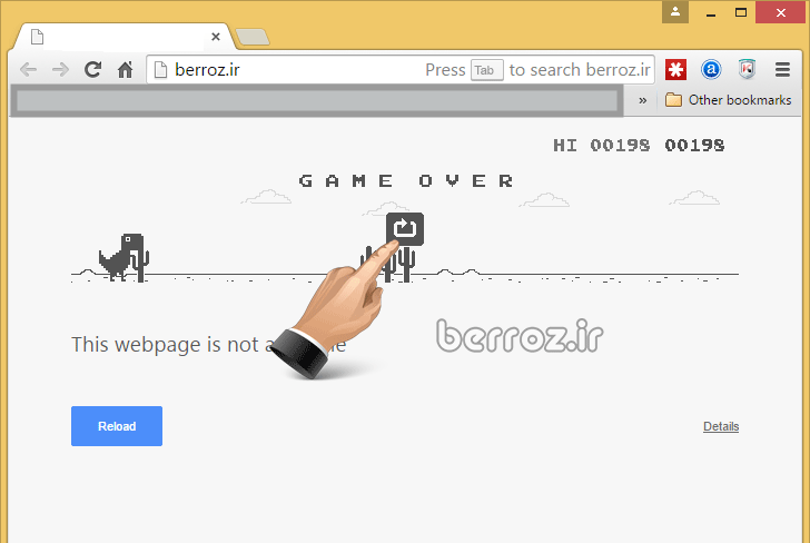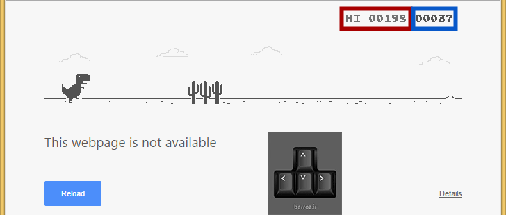 البته فکر می کنم شرکت گوگل برای همدردی با ما ایرانی ها که در سرعت و پهنای باند اینترنت با توجه به قابلیت های کشور از کشور افغانستان هم کمتر هستیم … یک بازی ساده و جالب را در هنگامی که کلا دسترسی به اینترنت نداریم روی همان صفحاتی که ارور میدهند را اجرا می کند که شما در نقش یک بچه دایناسور باید از روی موانع با استفاده از کلیدهای جهت نما »