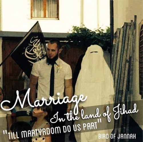 این روزنامه انگلیسی می افزاید: شمس با یک تروریست مغربی تبار به نام ابوالبراء که قبلاً وی را ندیده بود، ازدواج کرد و این دو نفر چون زبان همدیگر را نمی فهمند، از فرهنگ لغت برای مکالمه شان استفاده می کنند.